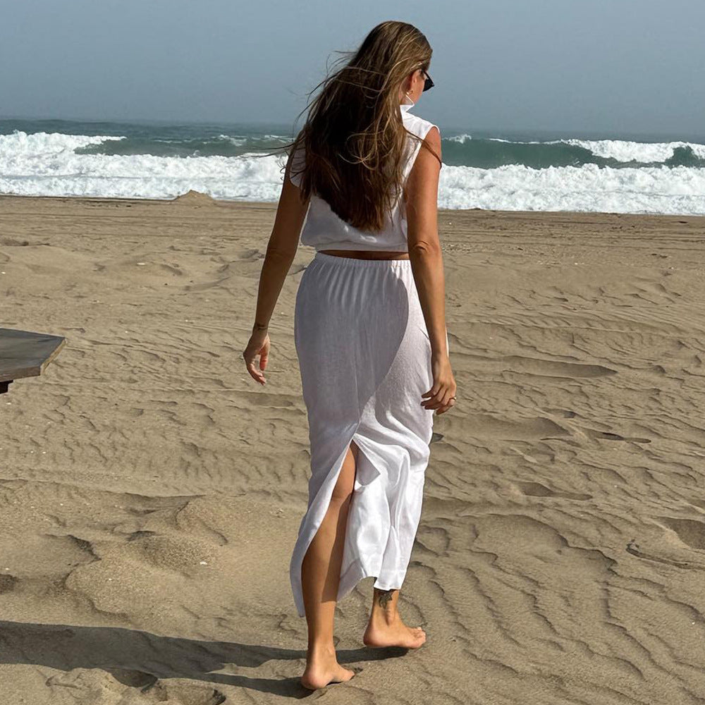New Lapel-Neckline Zipper Sleeveless Vest Dress Set